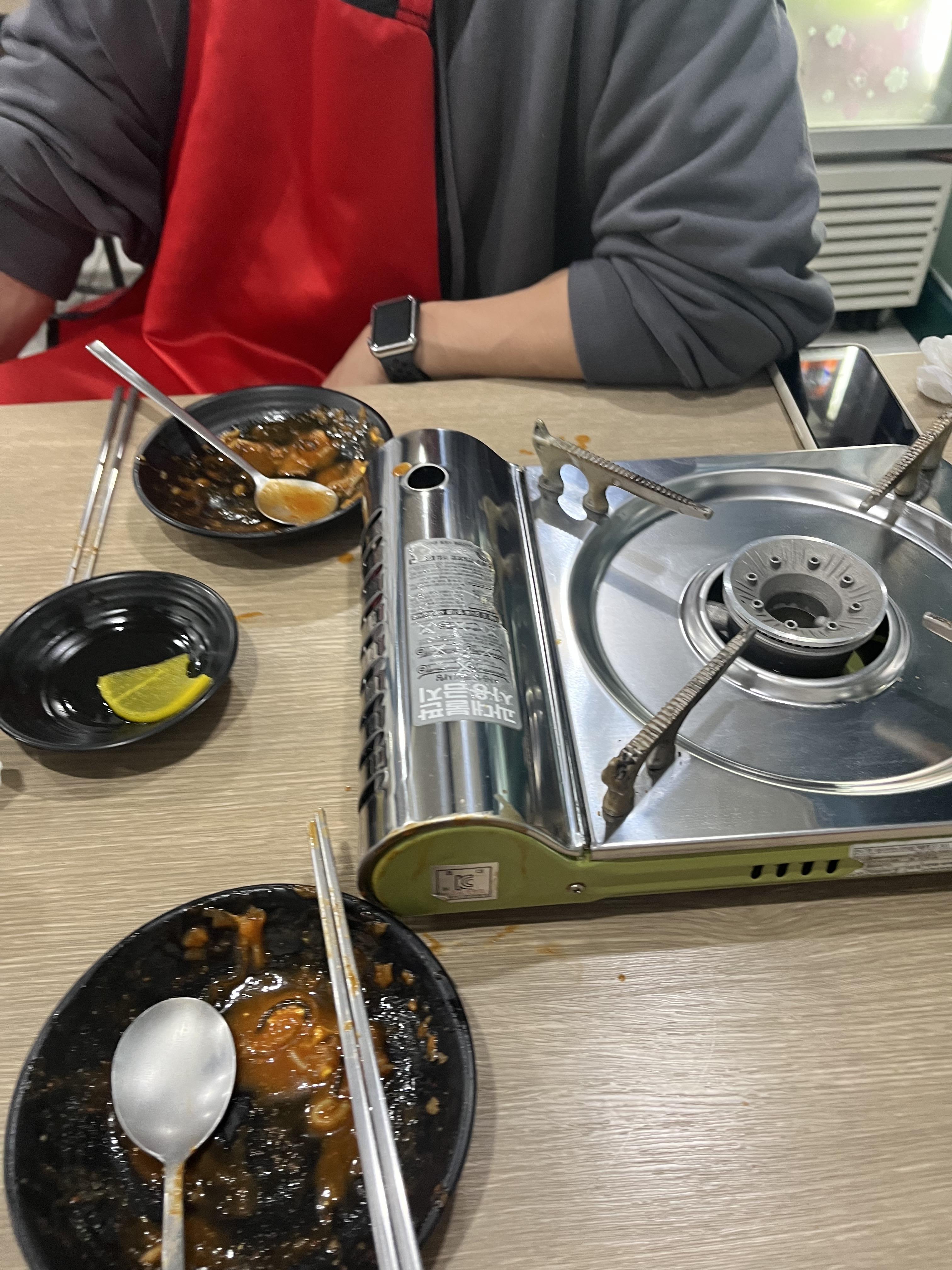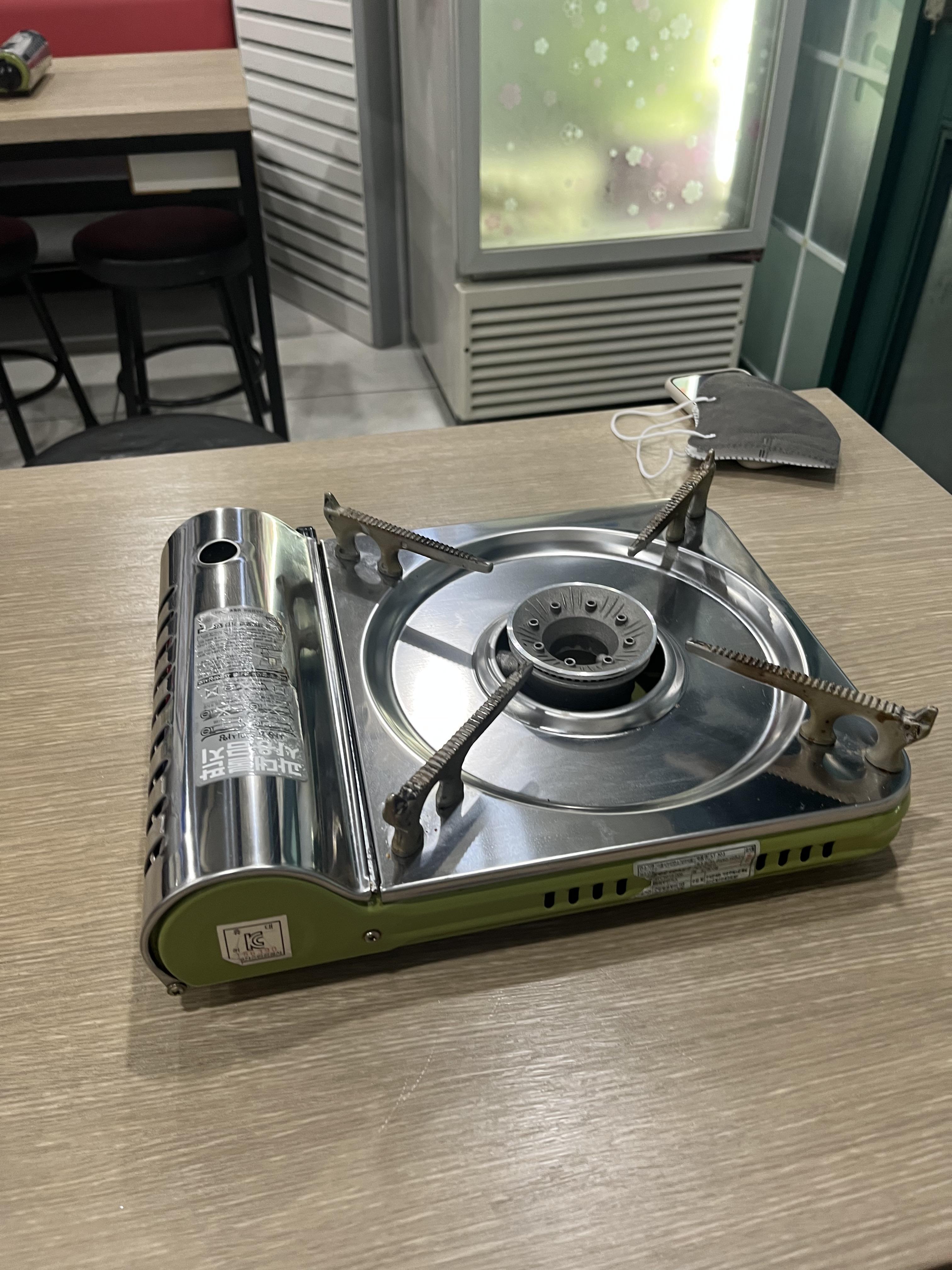 이렇게 책상 위에 버너가 있고, 요기에 끓여먹는 시스템이에요!